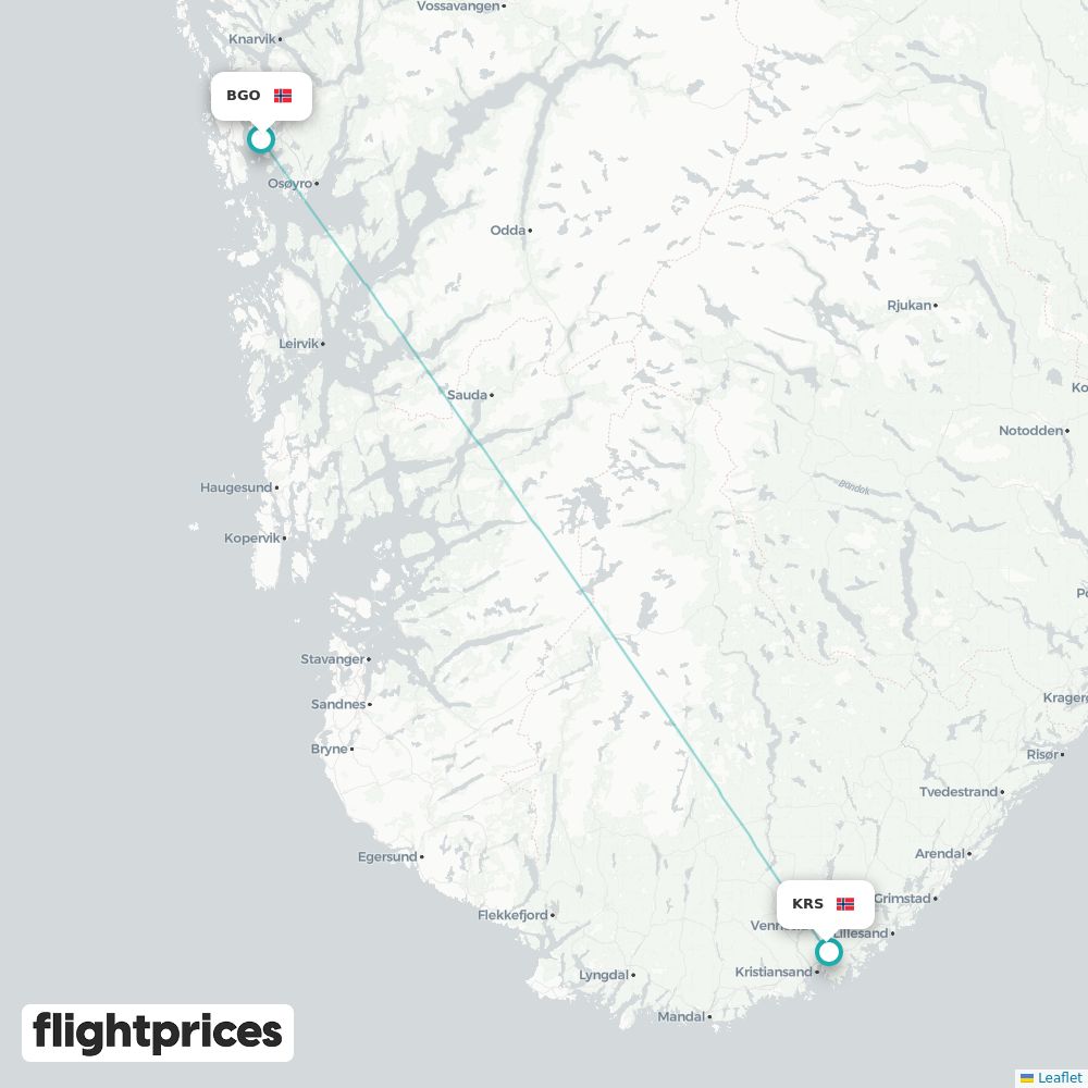 Et raskt overblikk over priser på Bergen (BGO) til Kristiansand (KRS) — laveste og typiske nivåer, prisintervall, billigste måneder og ukedager, flyselskapene på ruten og vanlig reisetid.