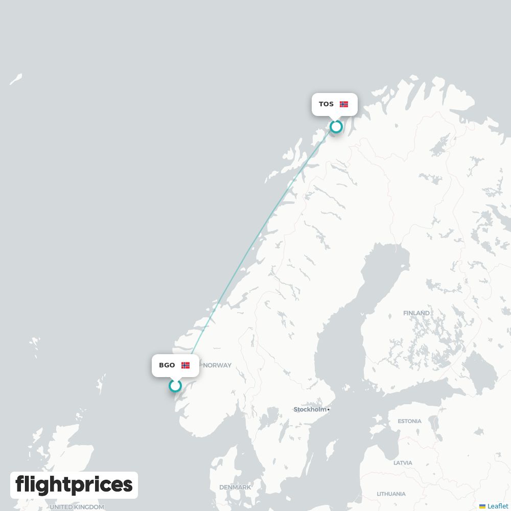 Et raskt overblikk over priser på Bergen (BGO) til Tromsø (TOS) — laveste og typiske nivåer, prisintervall, billigste måneder og ukedager, flyselskapene på ruten og vanlig reisetid.