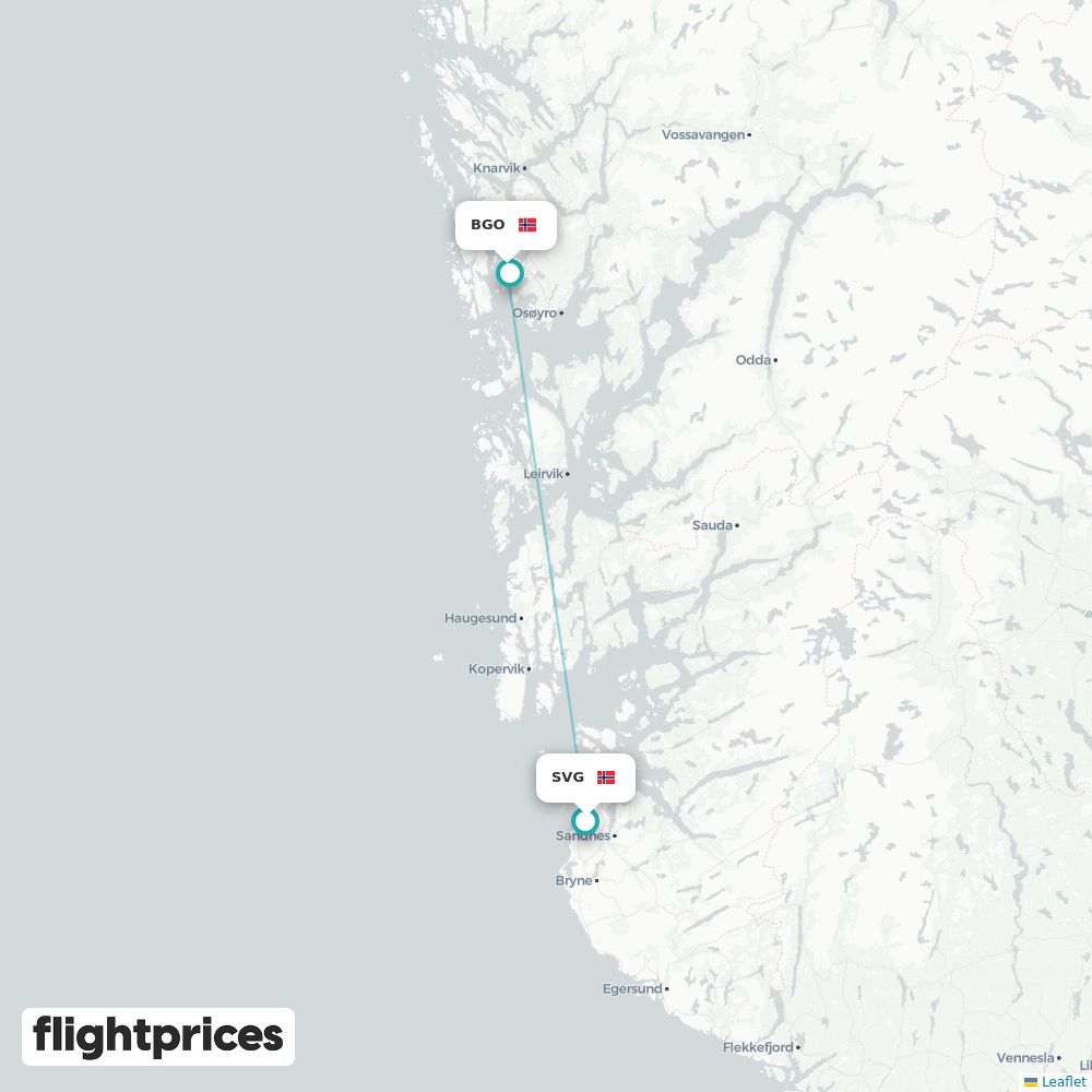 Et raskt overblikk over priser på Stavanger (SVG) til Bergen (BGO) — laveste og typiske nivåer, prisintervall, billigste måneder og ukedager, flyselskapene på ruten og vanlig reisetid.