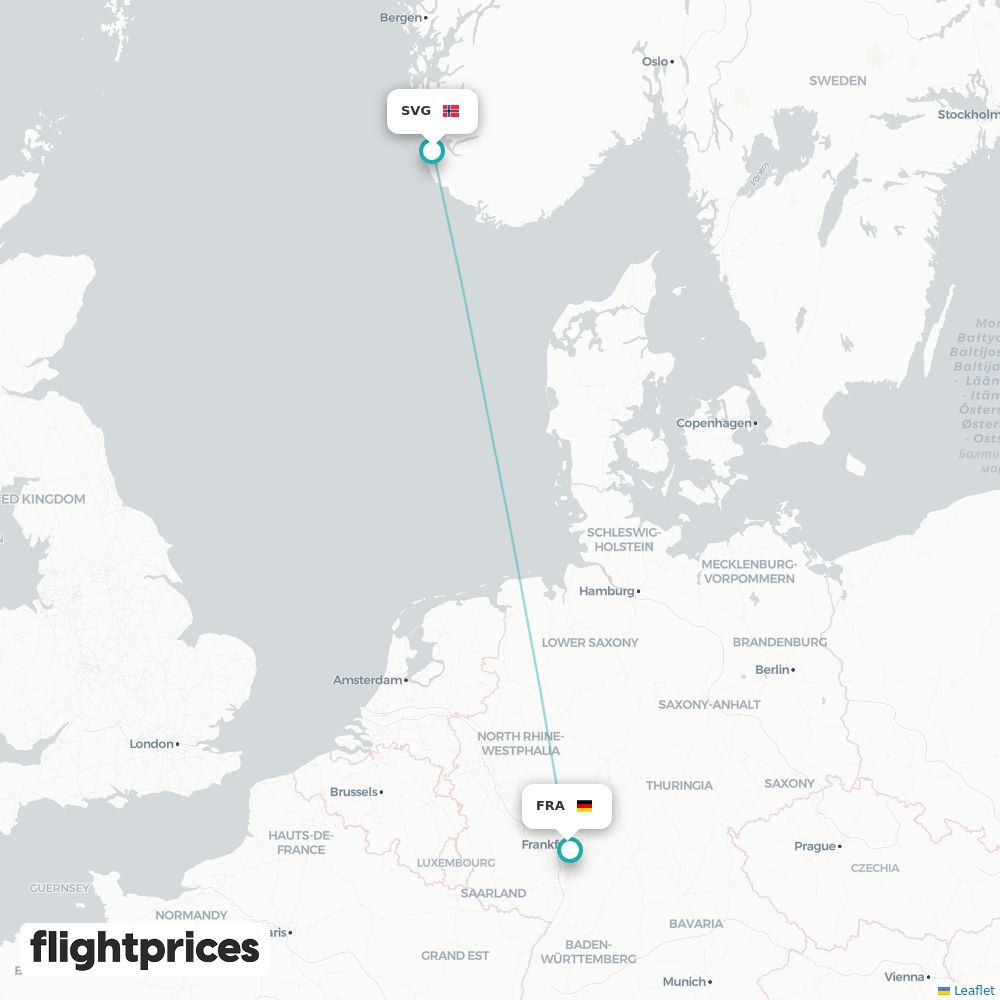 Et raskt overblikk over priser på Stavanger (SVG) til Frankfurt am Main (FRA) — laveste og typiske nivåer, prisintervall, billigste måneder og ukedager, flyselskapene på ruten og vanlig reisetid fra Norge til Tyskland.