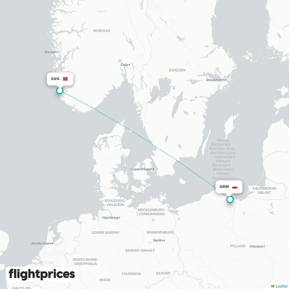 Et raskt overblikk over priser på Stavanger (SVG) til Gdansk (GDN) — laveste og typiske nivåer, prisintervall, billigste måneder og ukedager, flyselskapene på ruten og vanlig reisetid fra Norge til Polen.
