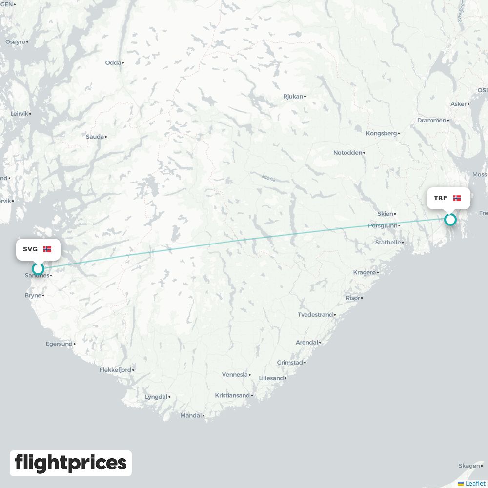 Et raskt overblikk over priser på Stavanger (SVG) til Oslo (TRF) — laveste og typiske nivåer, prisintervall, billigste måneder og ukedager, flyselskapene på ruten og vanlig reisetid.