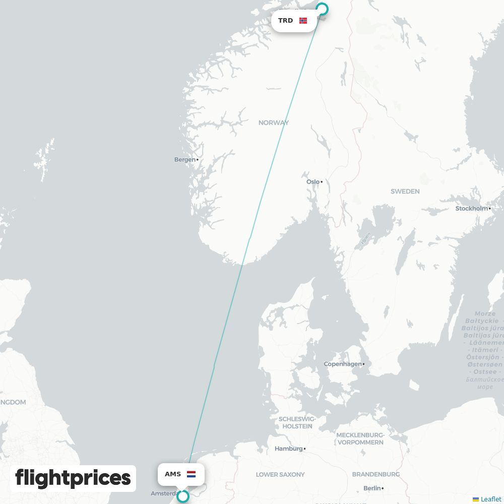 Et raskt overblikk over priser på Trondheim (TRD) til Amsterdam (AMS) — laveste og typiske nivåer, prisintervall, billigste måneder og ukedager, flyselskapene på ruten og vanlig reisetid fra Norge til Nederland.