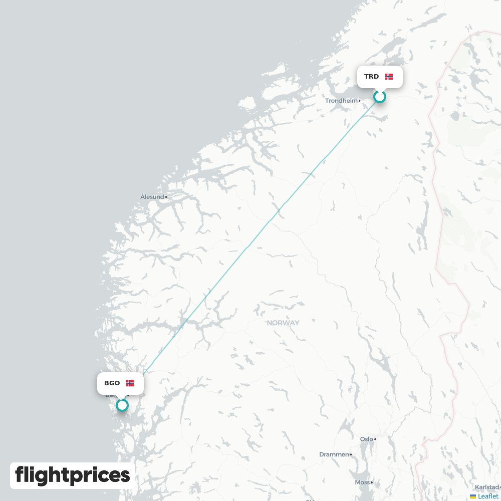 Et raskt overblikk over priser på Trondheim (TRD) til Bergen (BGO) — laveste og typiske nivåer, prisintervall, billigste måneder og ukedager, flyselskapene på ruten og vanlig reisetid.