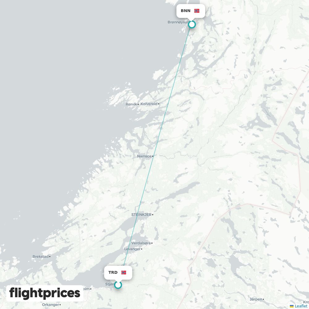 Et raskt overblikk over priser på Trondheim (TRD) til Brønnøysund (BNN) — laveste og typiske nivåer, prisintervall, billigste måneder og ukedager, flyselskapene på ruten og vanlig reisetid.